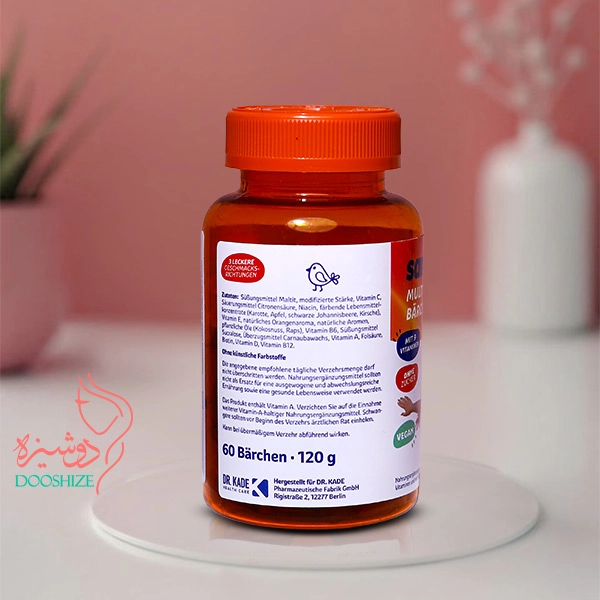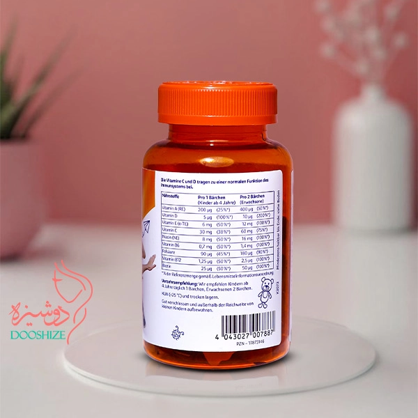 تامین ویتامین مورد نیاز بدن بالا رفتن سیستم ایمنی دارای ویتامین D برای استحکام استخوان به شکل پاستیل خرسی با طعم میوه ای دارای ویتامین های A، D، E، C، B6، B12، قابل استفاده برای تمامی سنین (کودکان 4 سال به بالا)